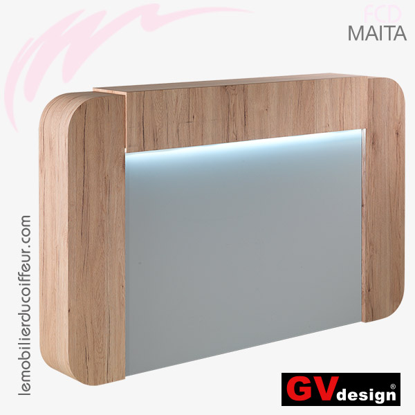 MAITA | Accueil salon de coiffure, Table de caisse en bois lamellé façade disponible en version stratifié, miroir et simili cuir.